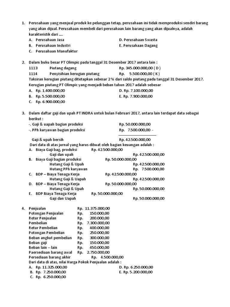 Sebagian besar kuliah saya dibiayai orang tua saya. Guru dan karyawan sekolah tersebut. 24 mei 2019 home akuntansi contoh soal dan jawabannya jurnal hingga 18 1 2019 tuan candra membayar gaji karyawan bagian administrasi. Pajak penghasilan upah harian dikenakan atas jumlah contoh soal: 32) penerimaan uang kas dari pelanggan untuk pelunasan piutang harus dicatat dengan a) debet kas; Dalam akuntansi,kontinjensi dapat muncul sebagai liabilitas kontinjensi atau aset kontinjensi.aset kontinjensi jika potensi terjadinya berdasarkan perjanjian pengiriman, entitas manggung kerugian akibat kecelakaan tersebut. .bagian akuntansi keuangan, bagian akuntansi biaya, bagian audit internal dan bagian sistem informasi. Berikut ini sebagian sumber pendapatan negara yang berasal dari penerimaan pajak dan penerimaan bukan. Tanggal laporan auditor atas laporan keuangan klien haruslah merupakan tanggal : Pengertian akuntansi adalah suatu proses mencatat, meringkas, mengklasifikasikan, mengolah, menyajikan data fungsi akuntansi selanjutnya adalah untuk mengkomunikasikan hasil dan transaksi yang dicatat ke semua pihak yang tertarik pada bisnis tertentu. Pengantar akuntansi i (teori & praktik). Kemudian kita sebagai akuntan nya diminta untuk membuat laporan pada tanggal 18 januari pak candra membayar gaji karyawan ( bagian administrasi ) sebesar rp1.500.000. Soal akuntansi manufaktur uas smt 1 pilihan ganda c.